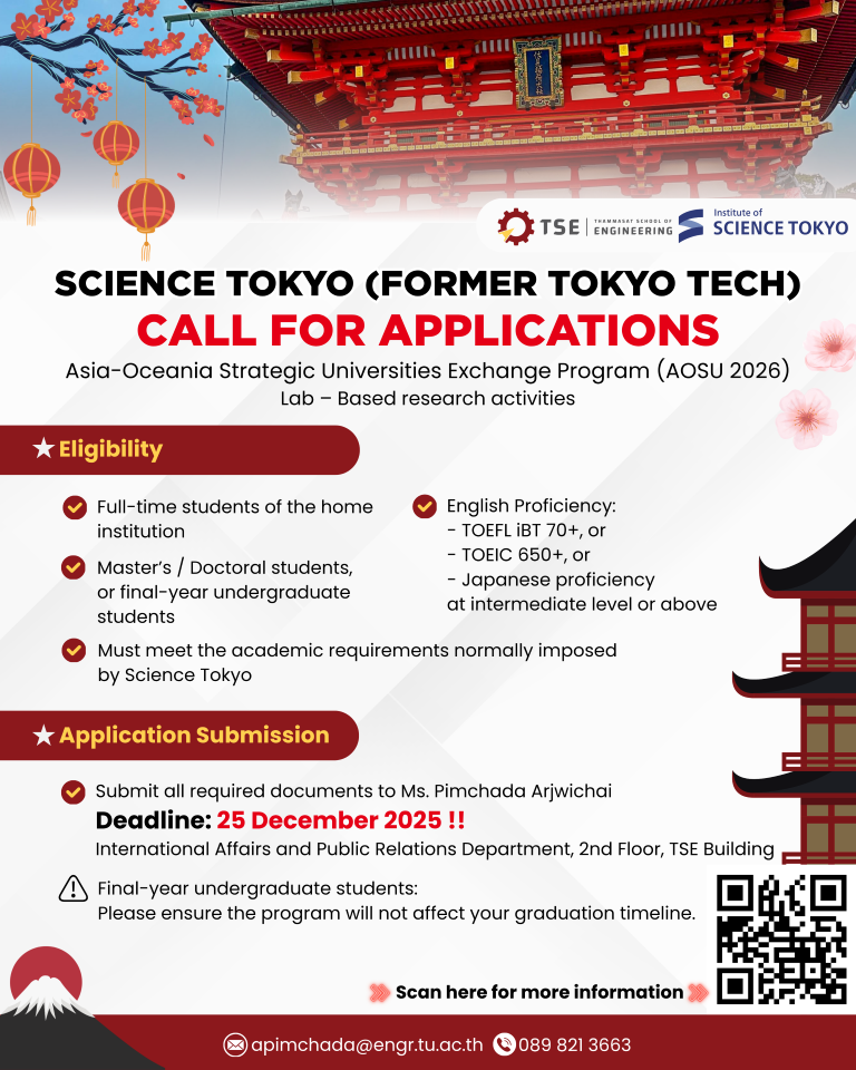 Thammasat School of Engineering invites students to apply for the short-term exchange program at Science Tokyo, under the following schools: