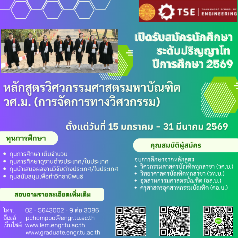 ภาควิชาวิศวกรรมอุตสาหการ คณะวิศวกรรมศาสตร์ มหาวิทยาลัยธรรมศาสตร์ ศูนย์รังสิต เปิดรับสมัครนักศึกษาระดับปริญญาโท ปีการศึกษา 2569
