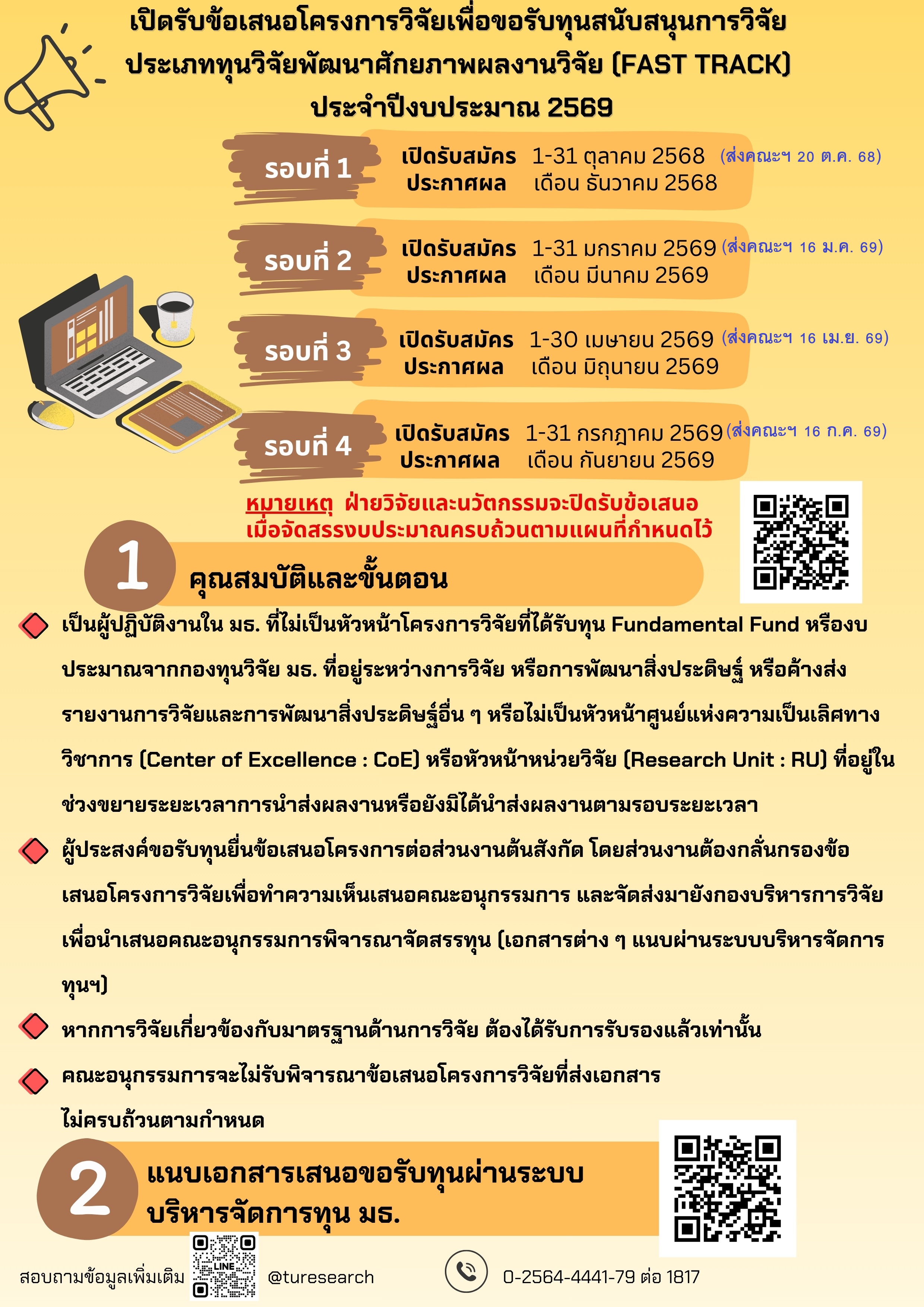 ทั้งนี้ ผู้สนใจโปรดศึกษาหลักเกณฑ์ ข้อกำหนด และแบบฟอร์มต่าง ๆ ที่เกี่ยวข้อง ของ ทุนวิจัยพัฒนาศักยภาพผลงานวิจัย (Fast Track) ประจำปีงบประมาณ 2569