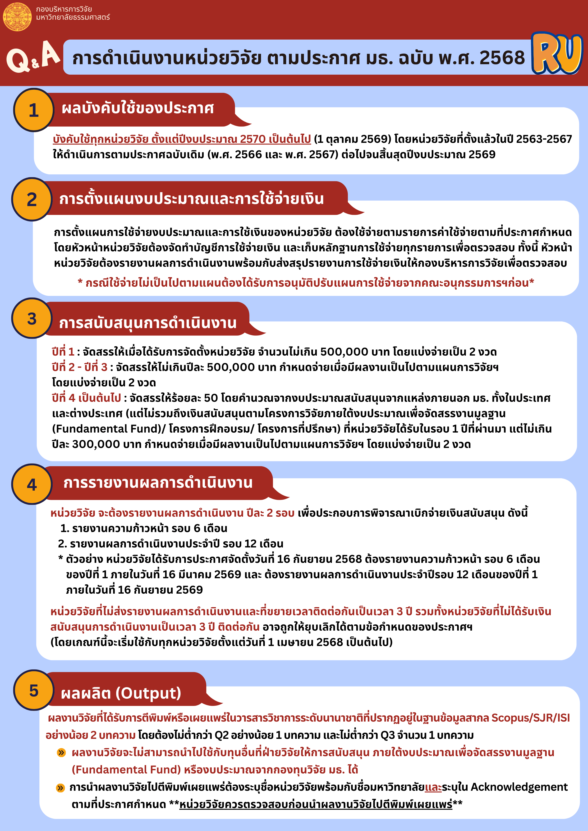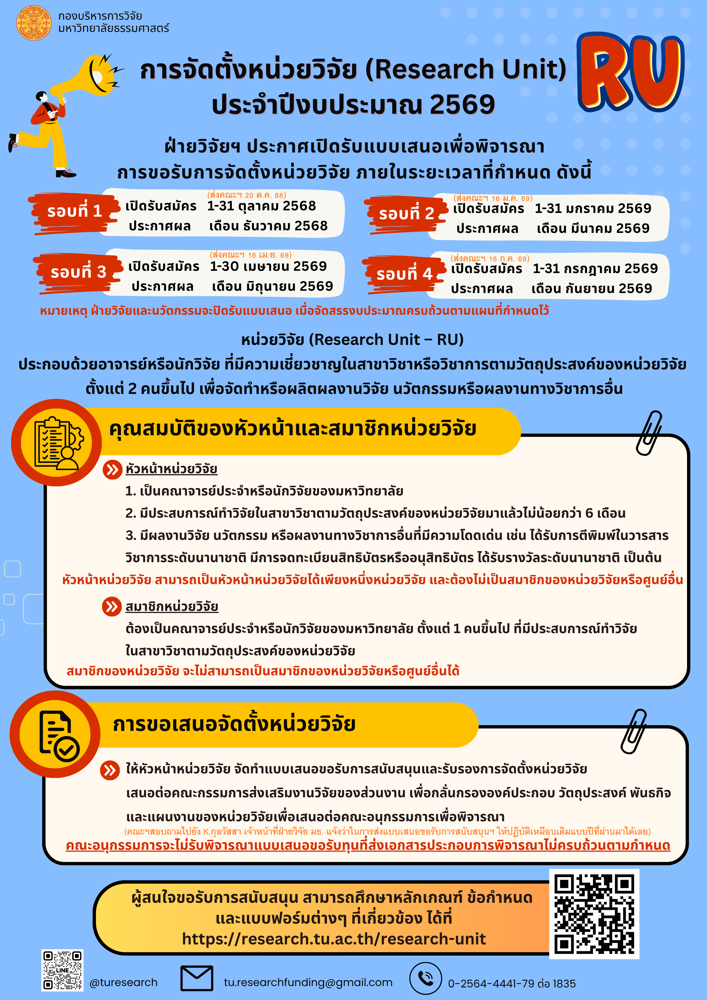 ทั้งนี้ ผู้สนใจโปรดศึกษาหลักเกณฑ์ ข้อกำหนด และแบบฟอร์มต่าง ๆ ที่เกี่ยวข้อง ของ การจัดตั้งหน่วยวิจัย (Research Unit – RU) ประจำปีงบประมาณ 2569