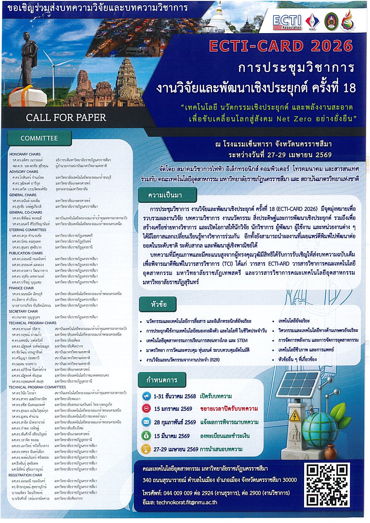 ม.ราชภัฏนครราชสีมา ขอความอนุเคราะห์ประชาสัมพันธ์ และขอเชิญเข้าร่วมส่งผลงานวิจัยเพื่อนำเสนอในการประชุมงานวิชาการวิจัย และพัฒนาเชิงประยุกต์ ครั้งที่ 18 (ECTI-CARD 2026)