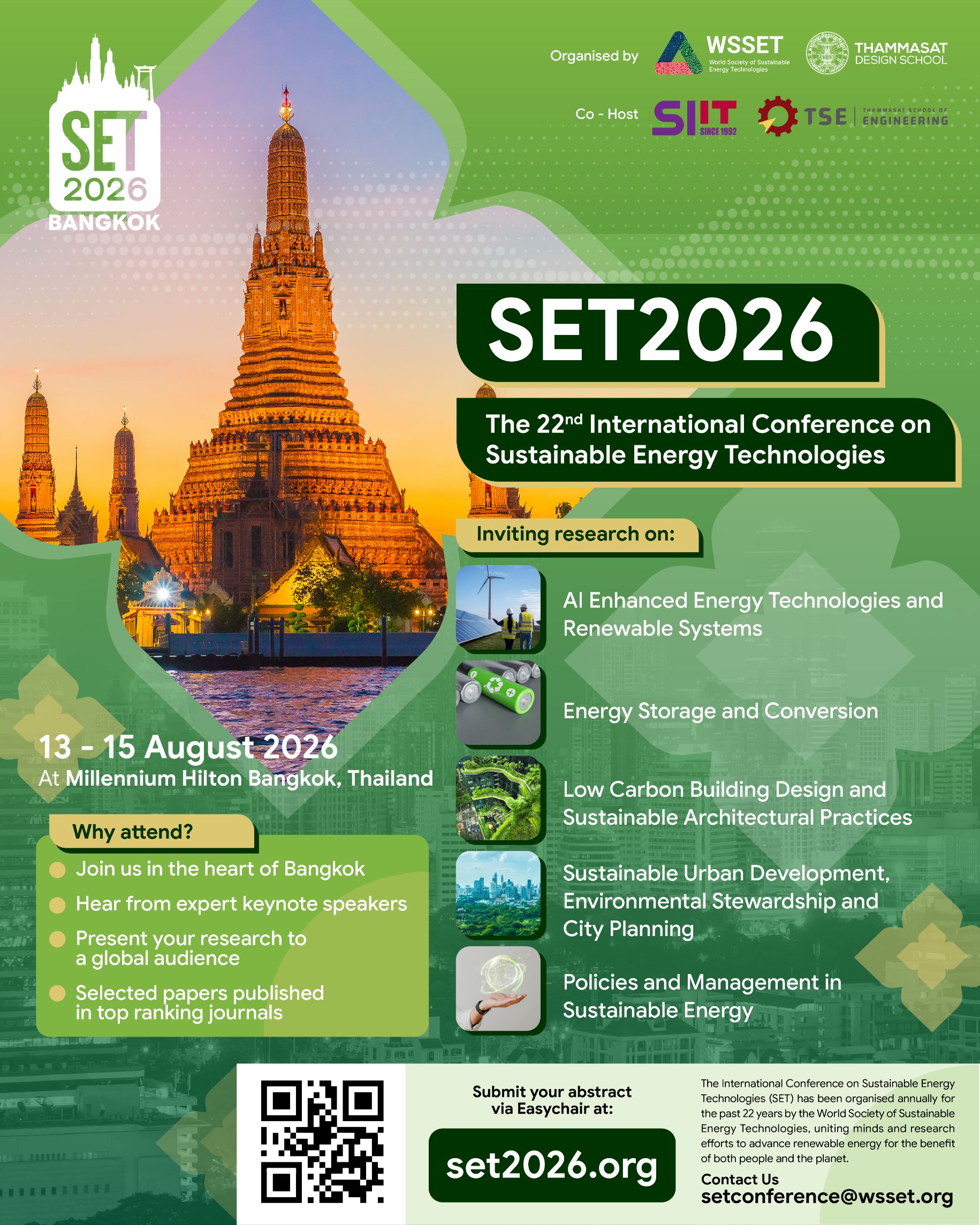 ขอเชิญชวนส่ง “บทคัดย่อ” เพื่อนำเสนอผลงานในการประชุมวิชาการนานาชาติ The 22nd International Conference on Sustainable Energy Technologies (SET2026)