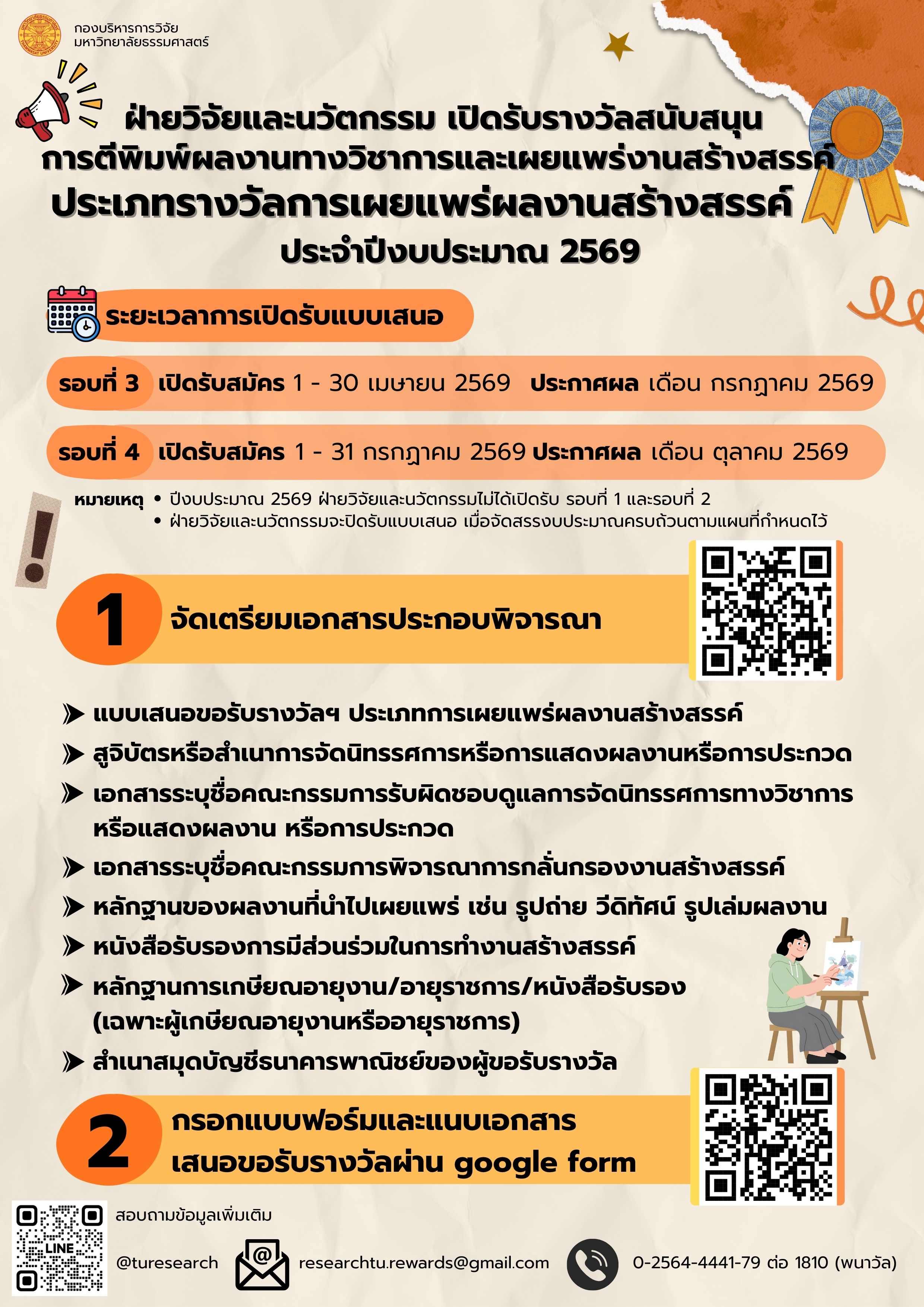 ผู้สนใจเสนอขอรับรางวัลสนับสนุนการตีพิมพ์ผลงานทางวิชาการและเผยแพร่งานสร้างสรรค์ ประเภทรางวัลการเผยแพร่งานสร้างสรรค์ ประจำปีงบประมาณ 2569 สามารถยื่นใบสมัคร รอบที่ 3 และรอบที่ 4 ผ่านระบบ Google Form ของ ฝ่ายวิจัย มธ. ได้ที่ Click ภายในระยะเวลาที่กำหนด